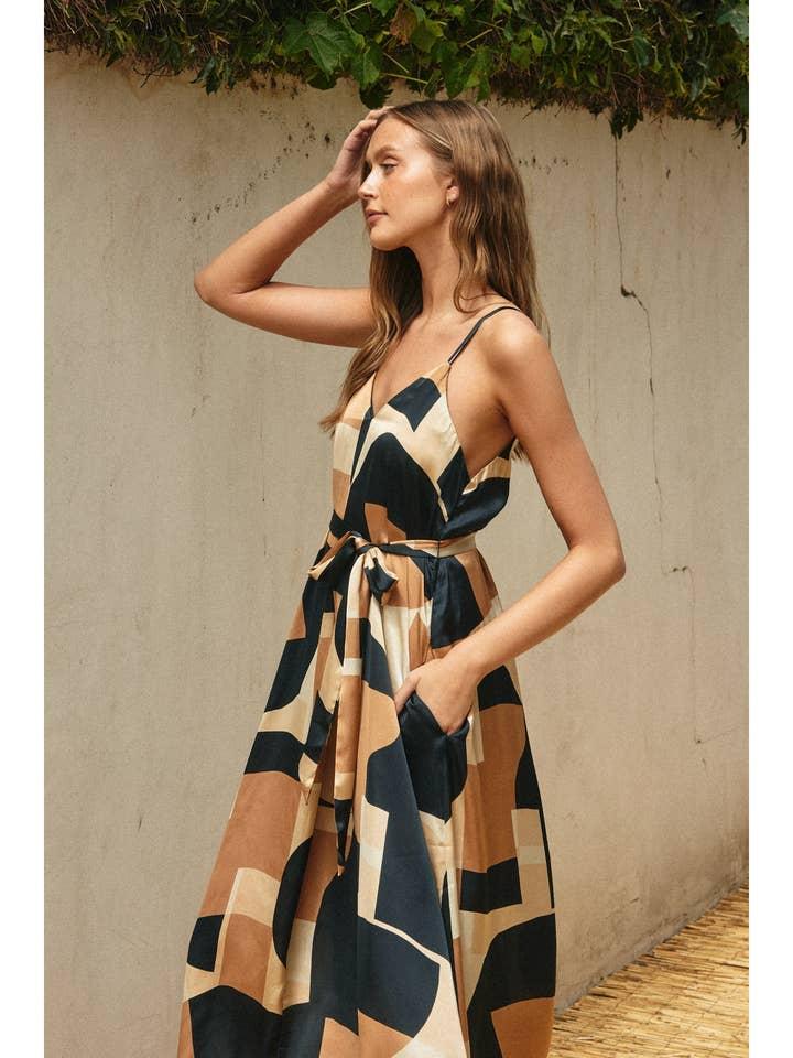 Rating Select ratingGive it 1/5Give it 2/5Give it 3/5Give it 4/5Give it 5/5 Geometric print maxi dress with extreme flared hem. Model is 5'10" and wearing size Small.- Dramatic A-line- Detachable belt- Slender shoulder straps- V-neck on front and back- UnlinedShell: 100% Polyester Lining: None Price $68.99 - 50.01% $34.49 Color Tan Sizes Small Medium Large Quantity